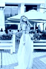 Cute girl with long blonde hair in long blue tulle skirt is walking on street