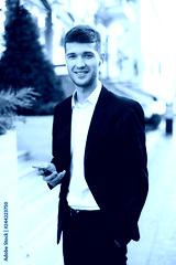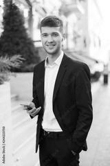 Young beautiful smiling man in black suit and white shirt with wireless earphones holding cellphone in hand happily looking in camera while spending time on street