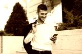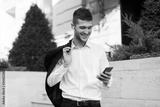Young cheerful man in white shirt with wireless earphones holding black jacket on shoulder while happily using cellphone outdoor
