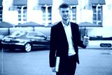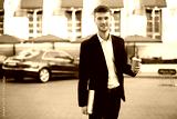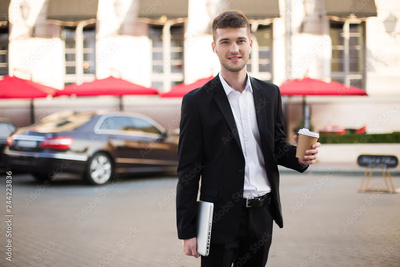 Young handsome businessman in black suit and white shirt with wireless earphones holding laptop and cup of coffe in hands while dreamily looking in camera with beautiful street on background
