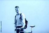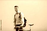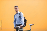 Young smiling man in blue shirt and black backpack standing with retro bicycle while happily looking in camera over orange background