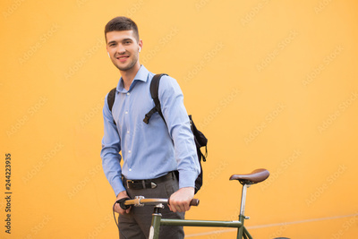 Young attractive man in blue shirt and backpack with wireless earphones standing with retro bicycle while dreamily looking in camera over orange background