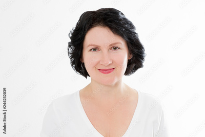 Middle age woman portrait. Wrinkle face and skin care concept. Menopause and anti aging treatment. Isolated on white background. Copy space. Makeup