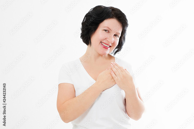 Middle age asian woman touching healthy heart isolated on white background. Feelings and love concept. Valentine day. Copy space