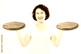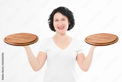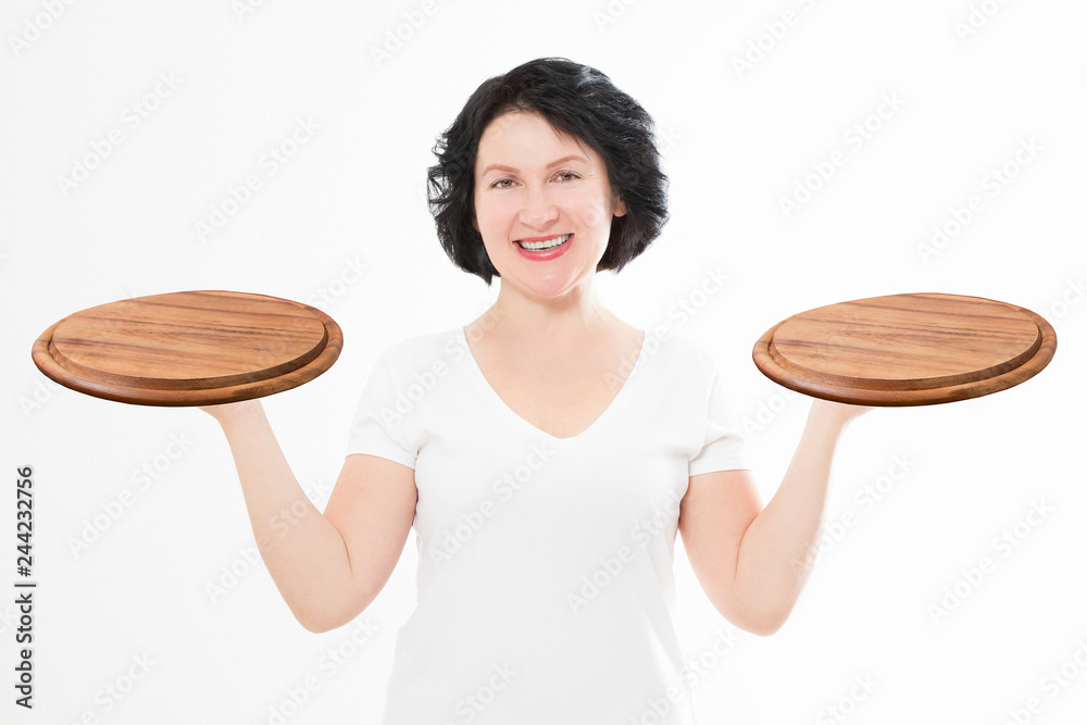 Wooden pan. Middle age attractive woman in summer tshirt holding empty pizza tray isolated on white background. Copy space and mock up. Blank template t shirt background.
