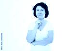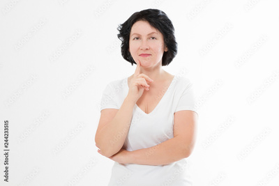 Aging middle age upset woman with wrinkles on face isolated. Stress and menopause. Copy space.