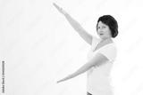 Middle age woman showing copy space by hands. asian woman isolated on white background. Advertising hand concept. Korean beauty