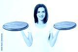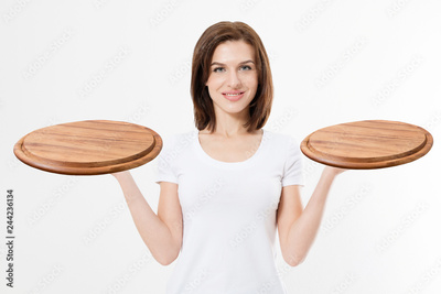 Wooden pan. Young woman in summer tshirt holding empty pizza tray isolated on white background. Copy space and mock up. Blank template t shirt background.