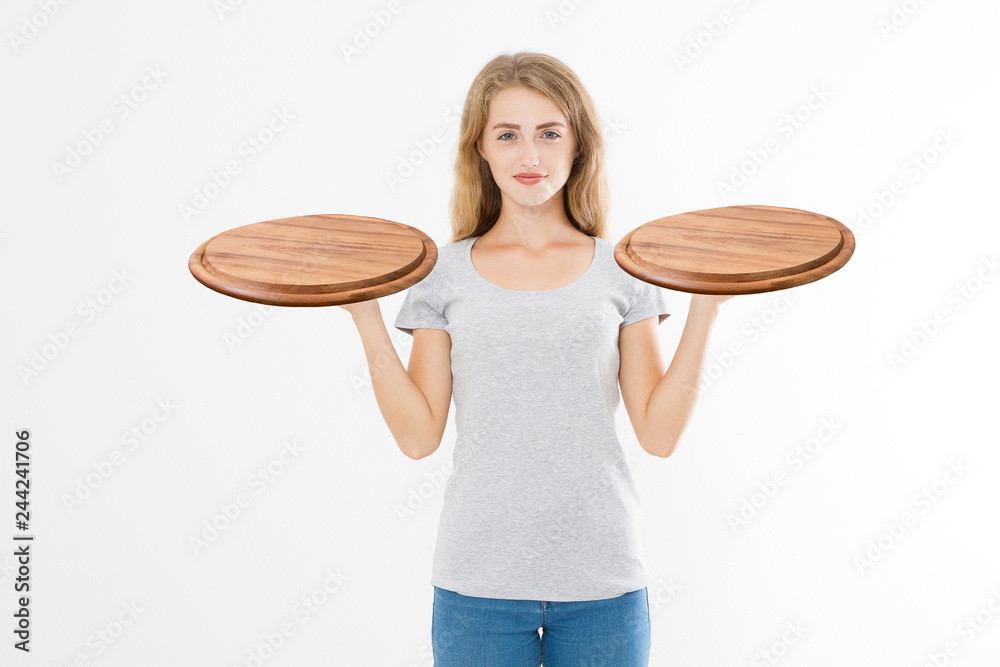 Wooden pan. Young woman in summer blank tshirt holding empty pizza tray isolated on white background. Copy space and mock up. Template t shirt background.