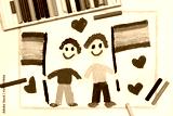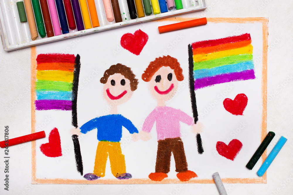 Colorful drawing: Happy gay couple with lgbt flag