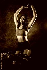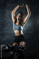 Cheerful slim young woman in sportswear raised hands up while sitting on exercise bike indoors.