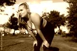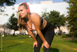 Young plus size woman in sporty top and leggings with red headphones tiredly looking aside while leaning on knees in city park