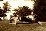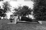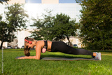 Young beautiful plus size woman in sporty top and leggings with red headphones standing in plank exercise while spending time in city park