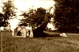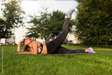 Young cheerful plus size woman in sporty top and leggings with red headphones lying on yoga mat happily raising leg up while spending time in city park