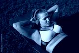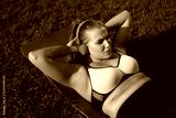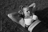 Young pretty plus size woman in pink sporty top and leggings with red headphones hardly shakes press on yoga mat in city park