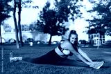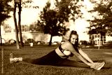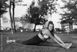 Young smiling plus size woman in sporty top and leggings sitting on twine on yoga mat while happily looking in camera in city park