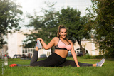 Young beautiful smiling plus size woman in pink sporty top and leggings sitting on twine on yoga mat joyfully looking in camera while stretching in city park