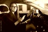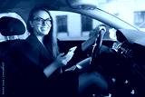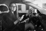 Young cheerful woman in black dress and eyeglasses happily looking in camera with cellphone in hand while sitting behind the wheel in car