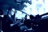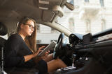 Young attractive businesswoman in black dress and eyeglasses thoughtfully using the tablet while sitting behind the wheel in car