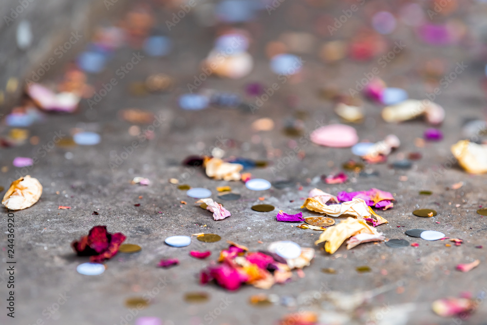 Macro low angle surface level closeup view of dried flowers petals after wedding ceremony party on street sidewalk road pavement with multicolor colors