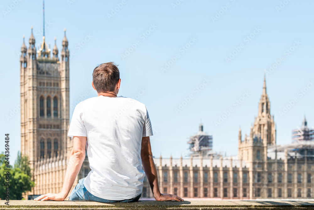 Back of young man with white tshirt sitting on railing in London looking at cityscape skyline of city with Thames River and Westminster Palace during sunny summer
