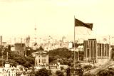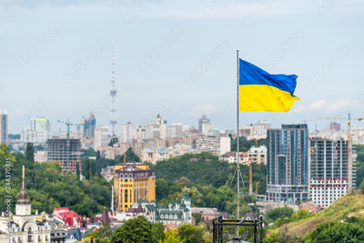 Kyiv, Ukraine Cityscape skyline of Kiev and Ukrainian flag waving in the wind during summer in Podil district