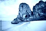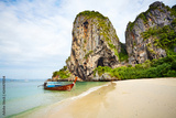 Long tail boat moored by a tropical island, Railay Beach, Thailand.