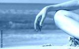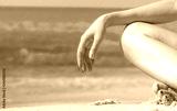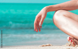 Closeup hand and leg of woman sit on sand beach at seaside with emerald green water. Happy young Asian woman relax and enjoy holiday at tropical paradise beach. Girl in summer vacation. Meditation.