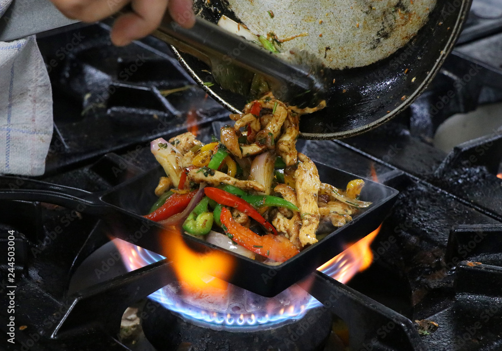mexican fajitas on sizzling plate