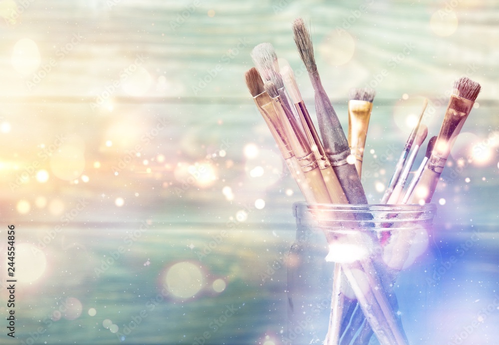 Row of artist paint brushes on background