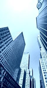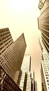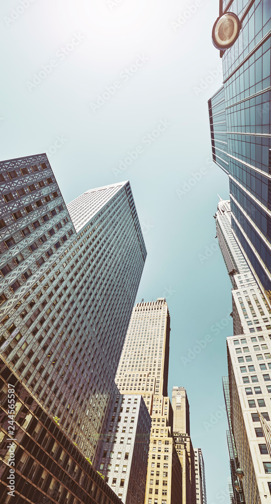 Looking up at Manhattan buildings, color toned picture, New York City, USA.