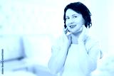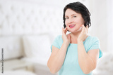 Smiling middle age woman at home . Skin care and dental medicine for white teeth. Blur background with copy space.