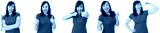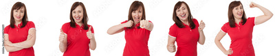 Close up isolated collage portrait of different female emotions and annoyed angry woman. Red blank t shirt and brunette hair front view. Negative and positive human emotions, face expressions.