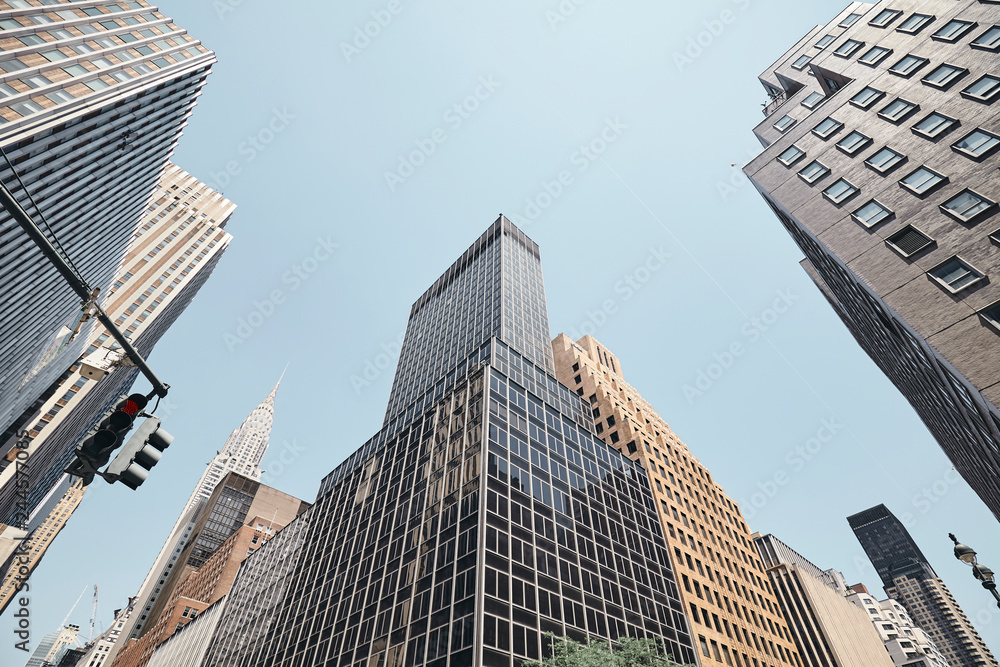 Looking up at Manhattan skyscrapers, color toned picture, USA.