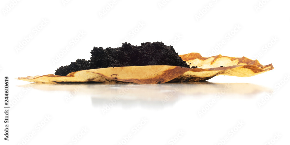 Low view of isolated brewed ground coffee filter paper on a white background.