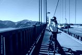 Golden gate bridge biking lady sightseeing in San Francisco USA. Young female tourist on bike tour enjoying the view stop riding bicycle taking picture shooting photographing on sunny day in summer.