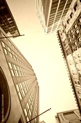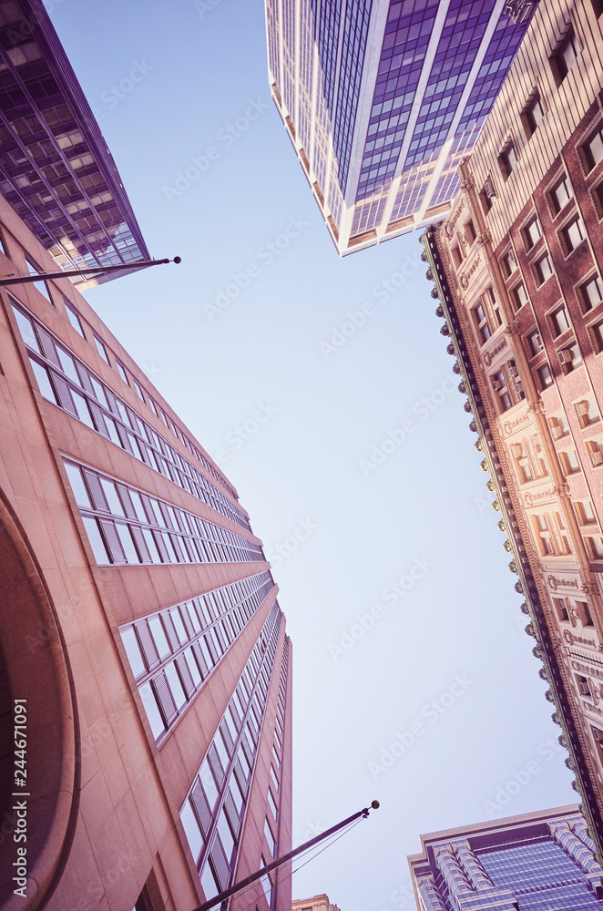 New York buildings, look up perspective, color toning applied, USA.