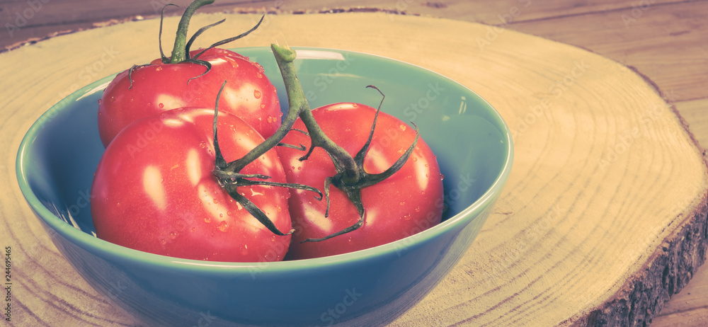 Red juicy tomatoes in a bowl on wooden background. Retro style.
