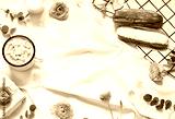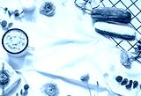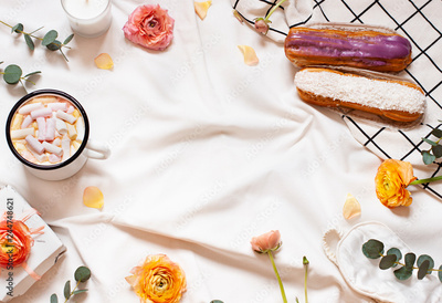 Concept flat lay with flowers, a cup of coffee, eclairs and leaves on the white blanket. Valentines day, Mothers day or Womens day top view frame. Copy space