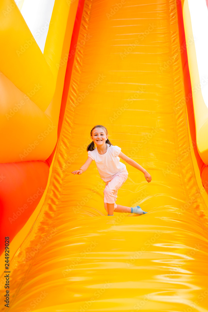 Happy little girl having lots of fun on a jumping castle while sliding.