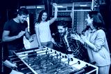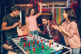 Cheerful happy young team stand at soccer table in playing room and cheering. Bearded guy play with another human. Frieds surround him.