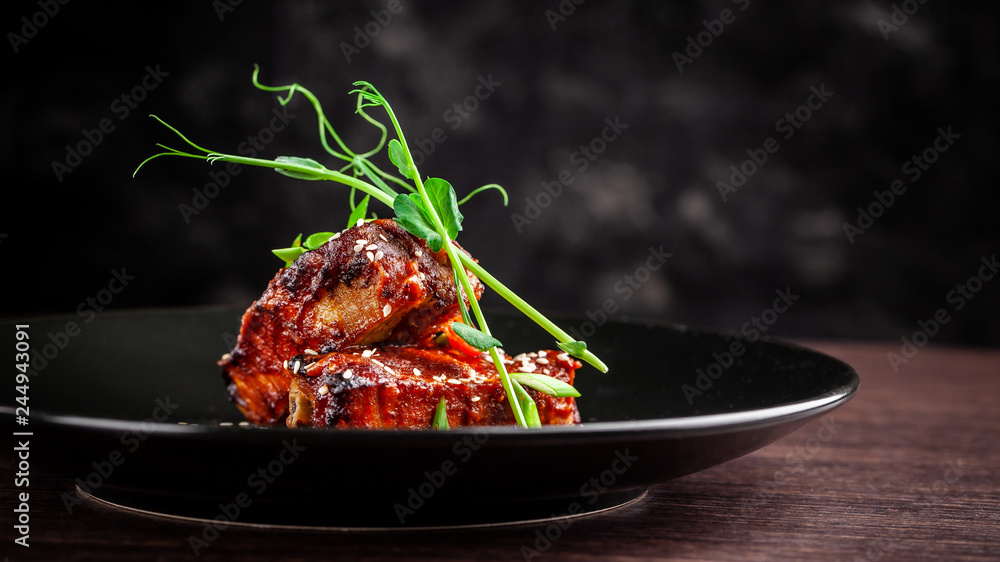 The concept of American cuisine. Roasted pork ribs, baked and glazed in barbecue sauce. Serving dishes in the restaurant on a black plate with sesame and micro green. Next to a glass of red wine.