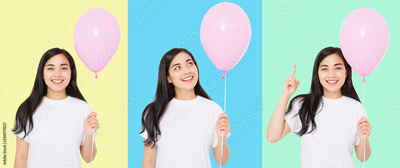 Happy birthday. Balloon party collage. Happy asian girl with balloons isolated on white colorful background. Copy space. Blank template t shirt.
