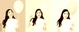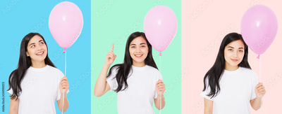 Happy birthday. Balloon party collage. Happy asian girl with balloons isolated on white colorful background. Copy space. Blank template t shirt.