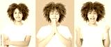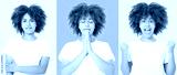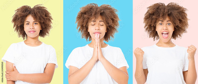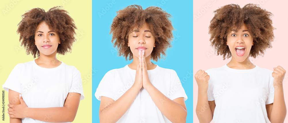 Happy and praying collage of young dark skin woman isolated on colorful background in tshirt clothes. Copy space. Mock up. White template blank summer t shirt. Curly hair girl