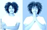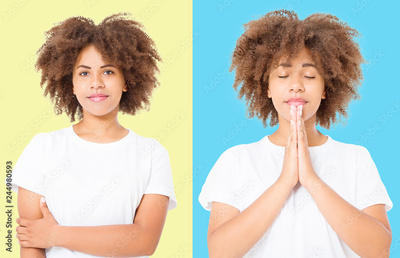 Collage of praying and smiling young afro american girl. African woman in summer shirt isolated on colorful background. Copy space. Mock up. Make a wish