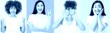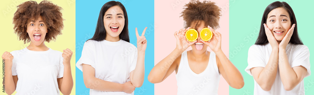 Collage of surprised shocked excited asian and african american women face isolated on colorful background. Young asian girl in summer t shirt. Copy space