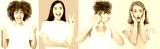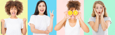 Collage of surprised shocked excited asian, caucasian and african american women face isolated on colorful background. Young asian girl in summer t shirt. Copy space
