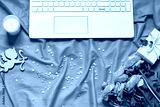 Valentines day concept flat lay with a keyboard on the bed blue blanket. Top view. Copy space