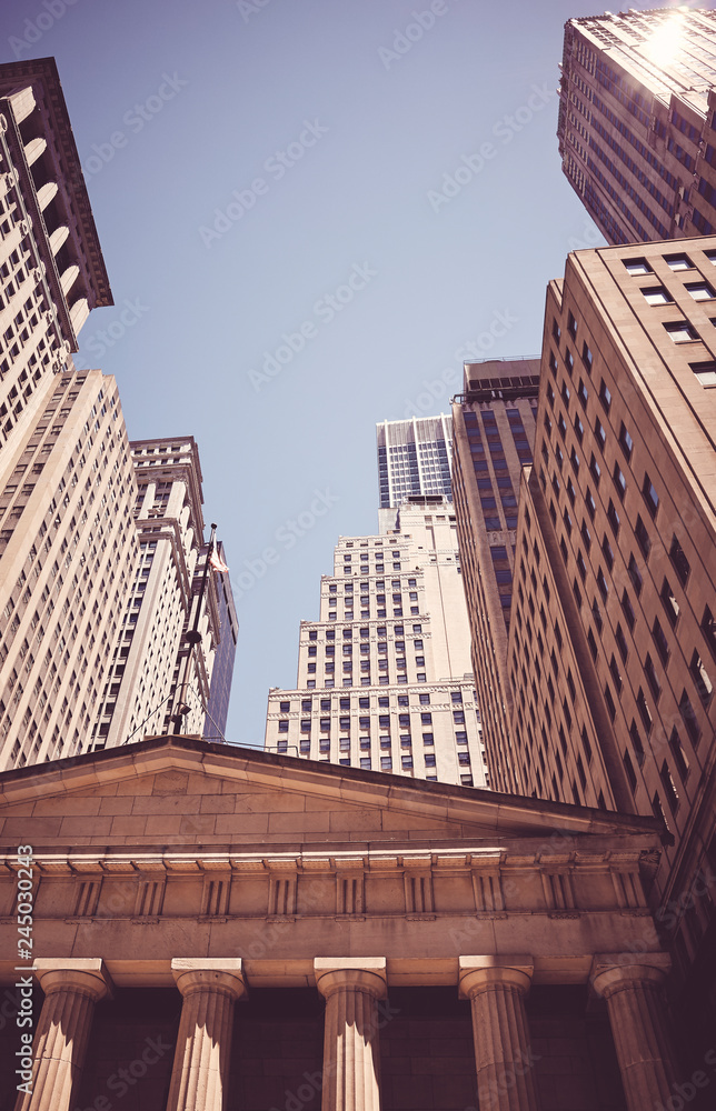 Looking up at Wall Street buildings, color toned picture, New York, USA.